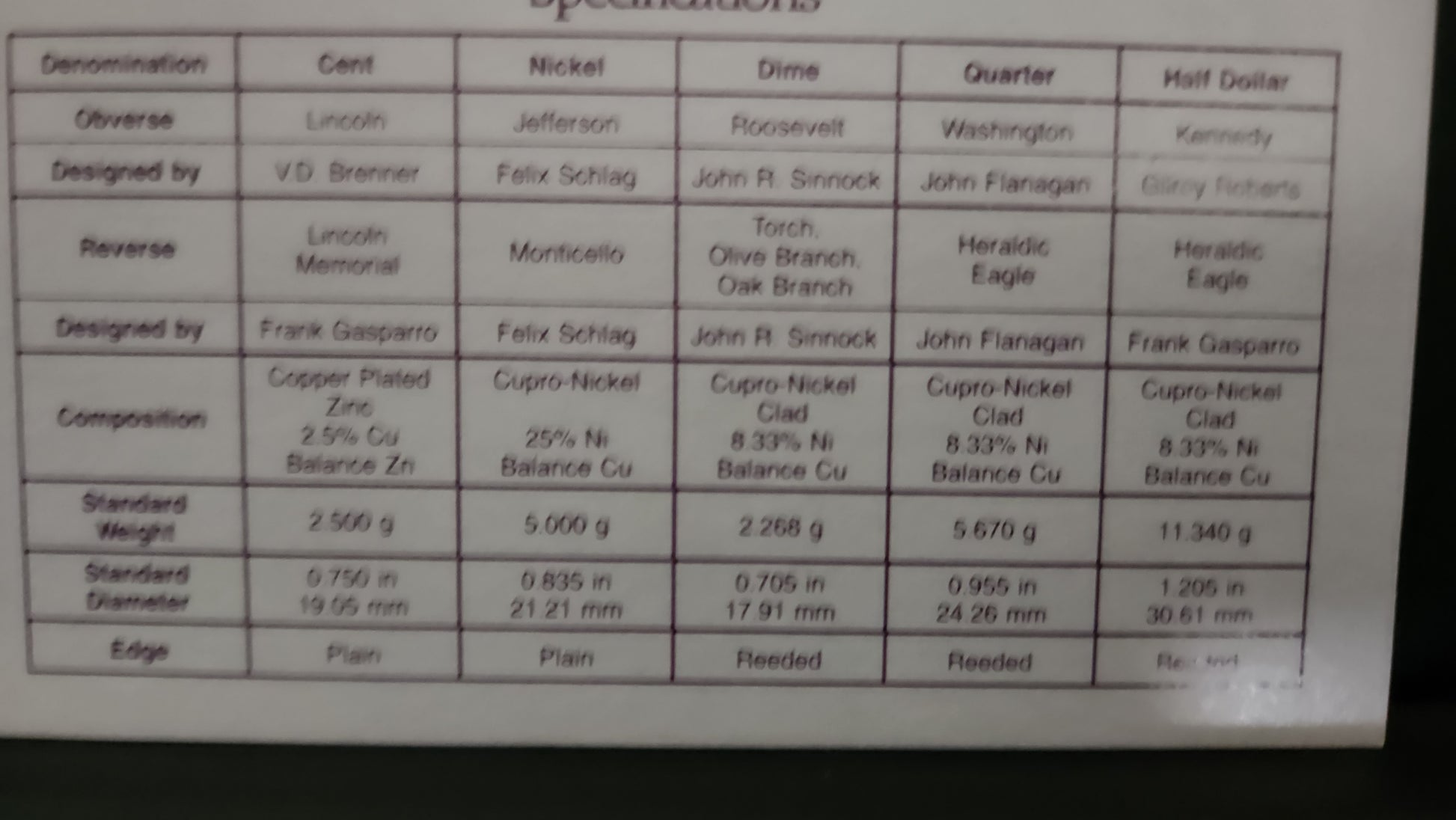 - Cent, Nickel, Dime, Quarter, Half-Dollar